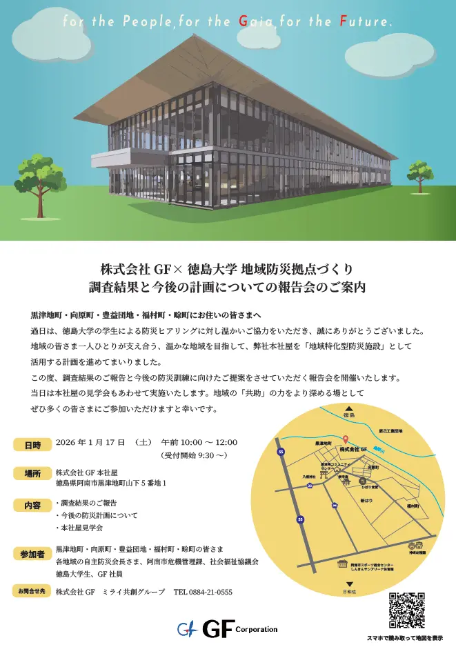 株式会社GFは、徳島大学と連携し、弊社本社屋を「地域防災拠点」として活用する取り組みを進めております 。この度、その一環として、これまでの調査結果のご報告と、あわせて本社屋の見学会を開催いたします 。