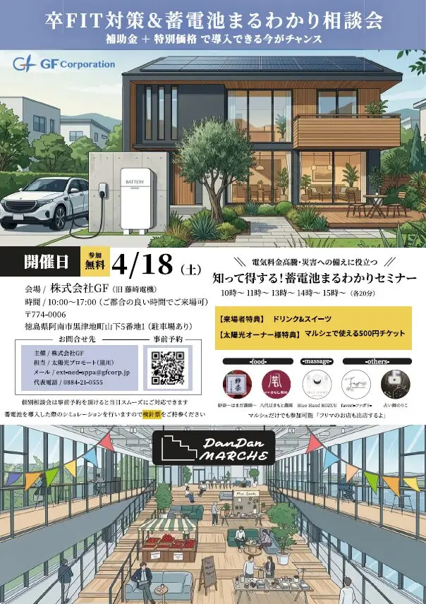 【イベント開催】4/18(土) 「卒FIT対策&蓄電池まるわかりらに相談会」開催のお知らせ(DanDanマルシェ同時開催)
